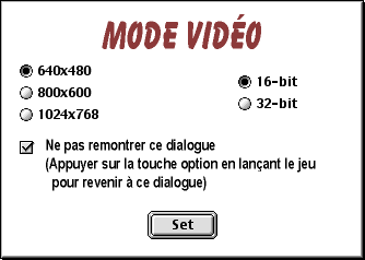 À la toute première utilisation de Cro-Mag Rally cette boîte de dialogue sur le mode vidéo apparaît à l'écran :