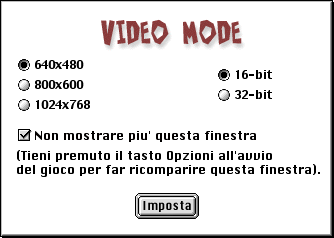 Il gioco è impostato con i parametri default sopra riportati. Devi stare molto attento a modificarli, dal momento che ogni modifica a tali parametri richiederebbe più VRAM. I Mac con solo 6MB di VRAM devono utilizzare i parametri minimi sopra riportati, altrimenti non ci sarebbe VRAM a sufficienza per tutte le configurazioni del gioco. Ne risulterebbero ridotte anche le prestazioni. Più alta è la risoluzione impostata, più lento sarà lo svolgimento del gioco.